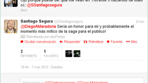 El director español, Santiago Segura, ya está perfilando su repertorio de estrellas que participarán en la quinta entrega de Torrente, la saga del policía marbellí que ha llenado las salas de cine. Es por eso que la mítica estrella del fútbol argentino, Diego Armando Maradona, se ha postulado como uno de los posibles malos de la nueva película. "Ojo porque puede ser que me vean en Torrente 5 haciendo de malo", ha asegurado en la red social de Twitter hace escasos minutos.