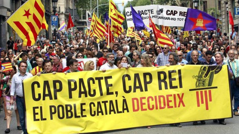 Por una Catalunya social y solidariaY la manifestación echo a andar con tres bloques bien definidos. En la cabeza iban los representantes de las organizaciones convocantes y de los partidos, cuyos líderes más conocidos parecen que delegaron protagonismo y presencia en sus compañeros de filas. Los gritos y consignas soberanistas y identitarias eran más abundantes en este parte de la manifestación; los gritos como: "Independencia para cambiarlo todo", "Ni pacto, ni rey, proceso constituyente" o "Los catalanes no tenemos rey. Ni rey ni transición" animaron el recorrido que, por un fallo técnico, no contó con el debido servicio de megafonía que enmudeció cruzada la plaza de catalunya. En un segundo bloque los lemas sociales iban precedidos por dos pancartas, una del Procés Contituent que rezaba: "No al pago de la deuda", y la de la Assamblea Nacional Catalana, con el lema: "Sí a una Catalunya social y solidaria. Sí a la República Catalana Independiente".