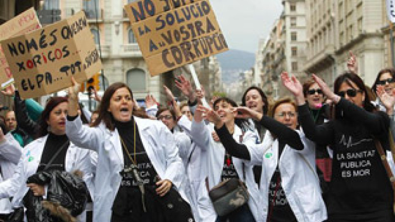 También se podía leer en otras pancartas "la salut no té preu" o "Retalleu la corruPPCiU" y "amb la salut no s'hi juga" o "prou de retallades" en las pegatinas que llevaban los manifestantes, algunos de ellos ataviados con batas blanca y verdes.