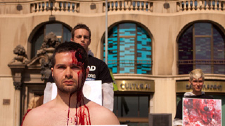 Desnudo y ensangrentado para protestar, de forma simbólica, por la matanza de focas en Canadá. Junto a él, otros veinte activistas de Igualdad Animal, que descolgaron en el consulado canadiense en Barcelona una pancarta con el lema: "Derechos para los animales. Basta de especismo" (fotogalería).