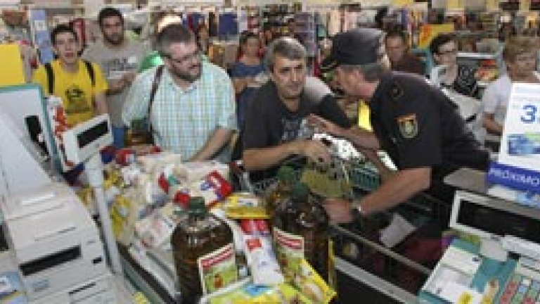 Unos cincuenta miembros del Colectivo la Trastienda y de la Plataforma por la Renta Básica en Extremadura han entrado esta mañana en el centro de Carrefour en la capital extremeña, de donde han sacado cuatro carros de alimentos básicos, que han sido incautados por la policía a la salida.