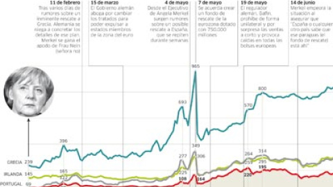 Mayo - "Un paraguas» para España"Merkel aceptó participar en el rescate de Grecia a finales de marzo, pero hasta el 2 de mayo no permitió que se activase. Una vez puesto en marcha, la atención de los mercados giró hacia España. El 4 de mayo, José Luis Rodríguez Zapatero tuvo que desmentir un rumor que aseguraba que España pediría un rescate de 280.000 millones. El día 7, los países del euro pactaron la creación de un fondo de estabilización del euro de 750.000 millones, con la ayuda del FMI, ante el temor de que países como Portugal o España sufrieran un efecto contagio. Los rumores siguieron durante semanas y algunos de ellos partieron del Gobierno de Angela Merkel, como se comprobó después. En junio, Merkel atacó a la credibilidad de la economía aunque ella lo vistió como una defensa asegurando que "España o cualquier otro país sabe que ese paraguas [el fondo] está ahí".
