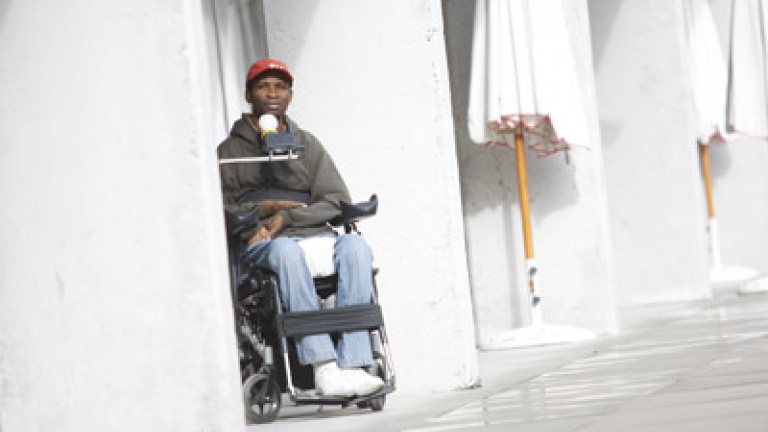 Miwa Monake tiene 43 años y no puede mover ni un músculo desde la barbilla (con la que desplaza el mecanismo automático de la silla de ruedas) hasta los pies. Es difícil adivinar que, detrás de la persona huesuda que se dobla en la silla, hay un hombre de 1, 95 de altura. Al mando de la silla alguien le ha colocado una pelota amarilla para facilitarle el contacto con la piel.