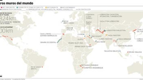Los bloques de hormigón de hasta nueve metros que laceran Cisjordania son un ejemplo. También los muros marroquíes que separan a los saharauis de sus familiares que quedaron en el Sáhara Occidental anexionado por Marruecos. Otras murallas son herederas de la Guerra Fría, como la franja que aún divide a las dos Coreas.