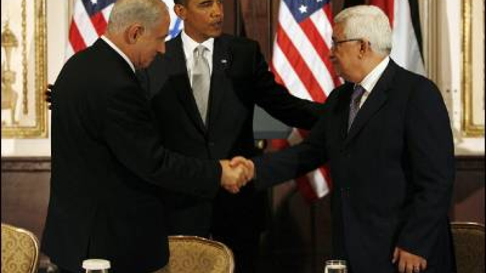 Esperanzas estadounidensesLa semana pasada, la Casa Blanca todavía contaba con la posibilidad de anunciar la reanudación de las conversaciones de paz. Pero el fracaso del esfuerzo mediador de Mitchell, que se pasó cuatro días yendo y viniendo entre Ramala y Tel Aviv sin conseguir poner de acuerdo a las dos partes, echó por tierra las esperanzas de Washington. Aún así, Obama, que ha desplegado sus esfuerzos voluntaristas en todas sus tareas de gobierno -desde la reforma sanitaria al rescate financiero- decidió reunir a los dos hombres que no se habían visto las caras desde la llegada de Netanyahu al poder.
