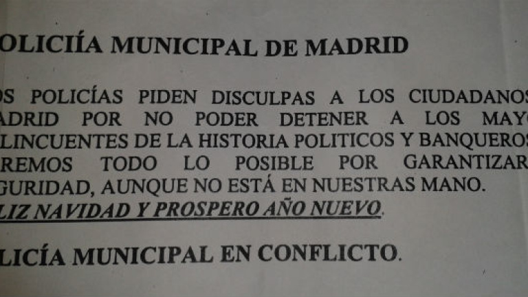 “Los policías piden disculpas a los ciudadanos de Madrid por no poder detener a los mayores delincuentes de la historia políticos y banqueros”. Con esta sencilla nota, un grupo de policías municipales de Madrid han salido a la calle para felicitar la Navidad a los madrileños y, de paso, criticar duramente la gestión de políticos y banqueros y advertir de la falta de medios que sufre la Policía Municipal de Madrid para ejercer su trabajo. “De cada 10 coches de patrulla sólo uno tiene chaleco antibalas”, explica a Público Andrés, policía municipal de 40 años, quien se niega a proporcionar su apellido por “miedo a posibles represalias”.