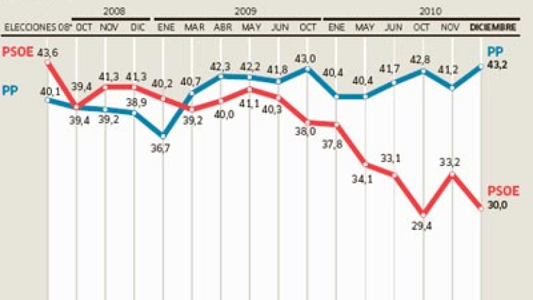 La tendencia electoral del PSOE sufre en diciembre una bajada de 3,2 puntos porcentuales respecto al mes anterior y el PP experimenta una subida de dos puntos. Así, los socialistas se dejan en el camino de esta legislatura lastrada por la crisis económica 13,6 puntos y el PP conquista 3,1 desde las elecciones generales de marzo de 2008.