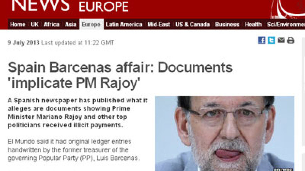 La edición digital de la británica BBC titula "El caso Bárcenas: los documentos implican a Rajoy" una información sobre los "pagos ilícitos" que recibieron tanto Rajoy como otros dirigentes de su formación. BBC, que siempre cita a El Mundo, también hace referencia a la entrevista concedida por el extesorero del PP, Luis Bárcenas, al diario madrileño en la que reconoce por primera vez que la letra es suya.