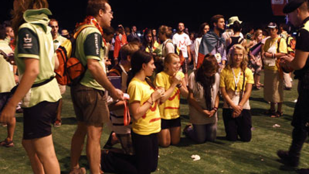 Dormían en las zonas de césped, junto a los barrizales o en las aceras. Y era tal el silencio que se oían los ronquidos, intercalados con sirenas de ambulancia y algún cántico aislado. El resto, principalmente jóvenes, se congregaban en las capillas o en las cafeterías. Así, mientras unos pasaban la vigilia entre rezos, pequeños grupos de jóvenes lo hacían charlando entre cervezas.