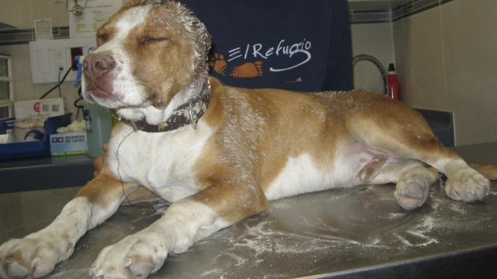 Posteriormente, le llevaron a la asociación El Refugio, que lo trasladó a una clínica veterinaria, donde hubo que hacerle una cura de urgencia sedándole previamente ya que no podía aguantar que se le tocasen las heridas y aullaba de dolor.