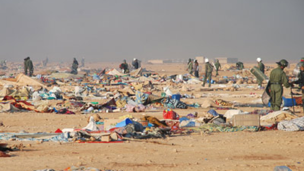 A los que se negaron a abandonar la zona, les cayó una lluvia de gases lacrimógenos y agua caliente, lanzada desde los helicópteros, mientras los antidisturbios entraban y sacaban a golpes de porra a los saharauis de sus tiendas nómadas. Muchas de ellas empezaron a arder y al poco ya sólo quedaba un erial cubierto de trozos de lona carbonizados en el lugar donde llegó a haber hasta 7.000 jaimas.