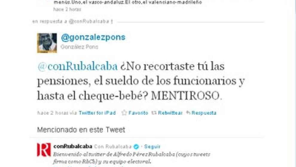En un duro intercambio de 'tuits' a la vista de todos los usuarios, el político conservador reaccionó a una serie de vídeos colgados en la web de Rubalcaba, con el título común Los números de las personas, en los que el PSOE defiende su gestión en política social confrontándola con la del PP.