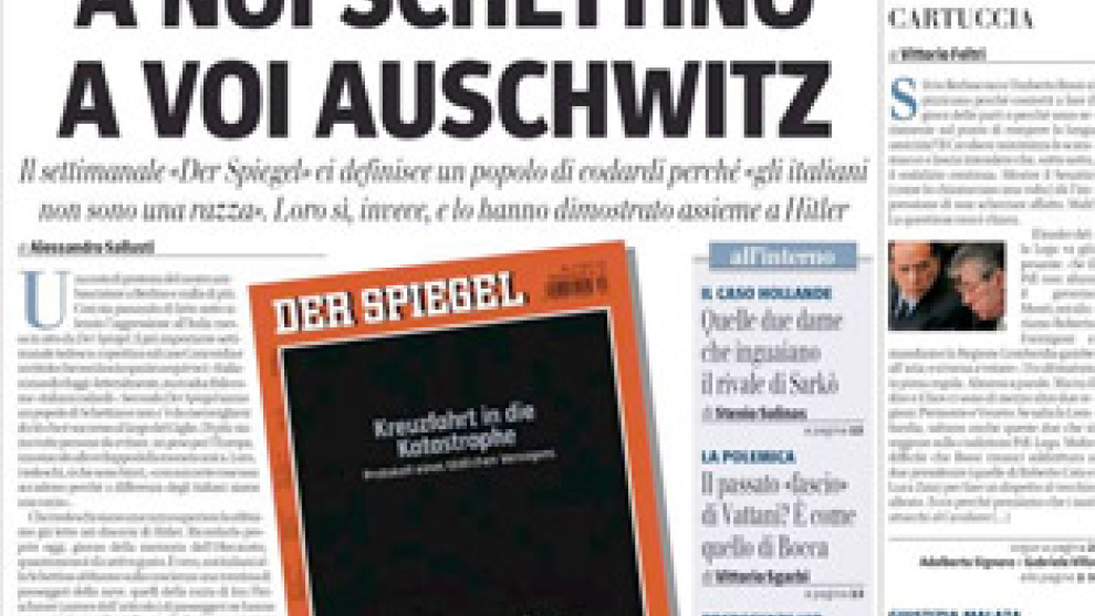 "Estos alemanes son aún arrogantes y peligrosos para Europa. Si dios quiere no volverán los cañones, pero el arma de la moneda no es menos peligrosa. Por esto, no debemos estar avergonzados. Nosotros tendremos un Schettino, pero a ellos Auschwitz no se lo quitará nadie jamás". Palabra de Alessandro Sallusti, director de Il Giornale, periódico de la familia Berlusconi, que no ha encontrado mejor manera que llevar a su portada el Día de la Memoria del Holocausto, este titular: "Para nosotros Schettino, para vosotros Auschwitz".