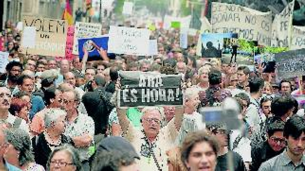 Ara resulta que això del 15-M és massa poc català. És una remor que ha passat a formar part de la línia mutant d'argumentari d'aquells que no volen reconèixer que alguna cosa amb substància està passant als carrers del sud d'Europa. Perquè, encara que alguns pensin que la cosa neix a Madrid, hem d'obrir el focus i incloure la creixent revolta antibunga-bunga italiana i les massives manifestacions de la geração à rasca portuguesa, que aviat tornaran al carrer. A Catalunya, un sector de l'opinió de dieta sobiranista ha fet córrer d'un conjunt de brames que han esdevingut una tesi certa: el 15-M parla en castellà. Això, agafat pel costat sociolingüístic, no faria sinó refermar la seva catalanitat. No hi ha res més nostrat que canviar de llengua tot just es fan crides en públic o es parla amb castellanoparlants. No hem d'anar a cap assemblea per veure com un grup de catalans passem al castellà de forma automàtica davant de qualsevol que parli la llengua de Cospedal. A les assemblees on he anat, amb la gent que he parlat, la quota de català no difereix de la normal a la ciutat de Barcelona.