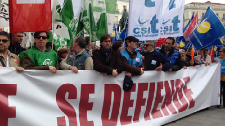 Numerosas banderas de los diferentes sindicatos que representan a los profesionales sanitarios han coloreado durante una hora la céntrica plaza madrileña. Militantes y simpatizantes de CCOO, UGT, CSIT, CSIF, SATSE, AMYTS, pacientes y ciudadanos madrileños se han vuelto a unir para insistir en el lema: "La sanidad no se vende, se defiende".