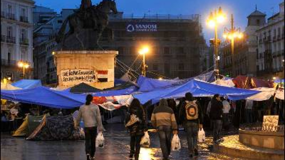 Los toldos que daban cuerpo al frágil habitáculo donde se afanan los organizadores de la acampada se multiplicaron por arte de lluvia. Los congregados que abarrotaron el kilómetro cero durante la pasada tarde noche comenzaron a replegarse: muchos, con el paso de las horas, fueron tragados por el Metro o se diluyeron en las arterias que dan a la Gran Vía, a Ópera, a Tirso de Molina; algunos buscaron refugio en los soportales de los comercios cercanos; decenas, cientos de ellos se metieron bajo techo, un patchwork de plásticos que contenía a duras penas la terca lluvia que durante las últimas horas convirtió Sol en un espacio severo para vivir, aunque enriquecedor para compartir.