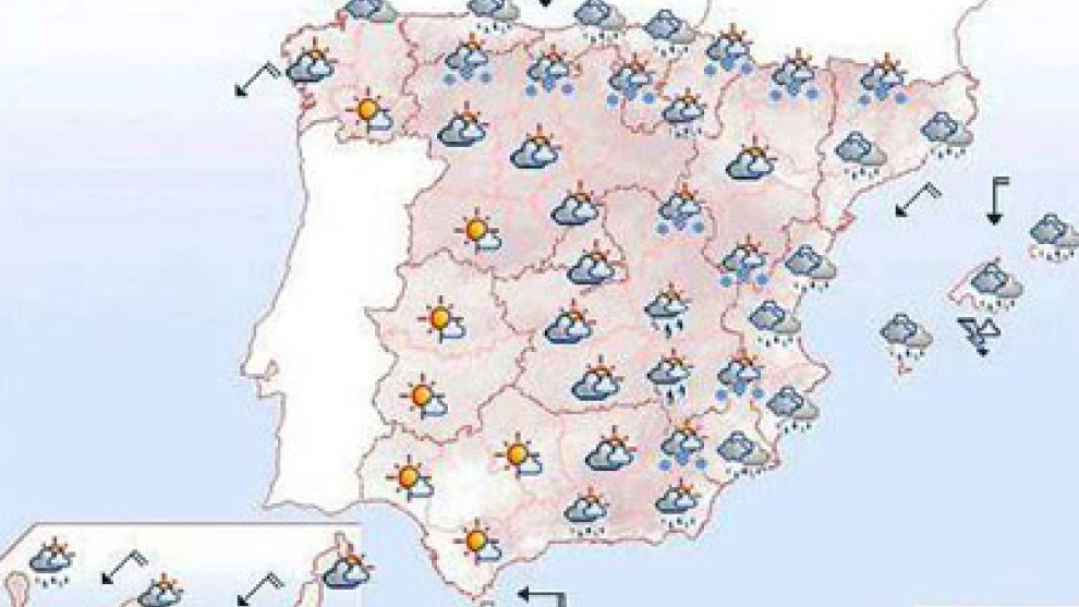 En Baleares, cielo muy nuboso con chubascos localmente moderados que pueden ir ocasionalmente acompañadas de tormenta. Cota de nieve a 900 metros y temperaturas sin cambios.