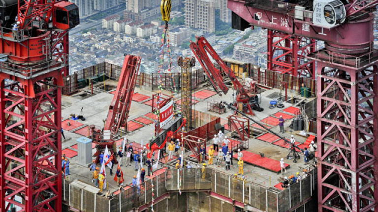 Los obreros colocan la última viga del que será el rascacielos más alto de China, y el segundo del mundo, cuya construcción terminará a finales de 2014.