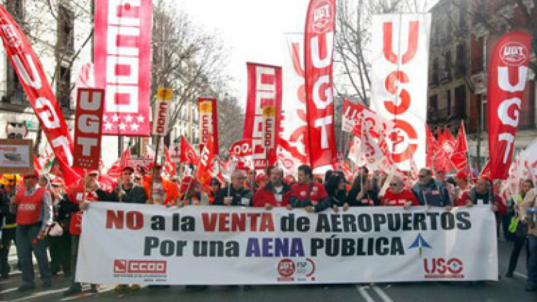 "Los paros se producirán hasta que el Gobierno rectifique", manifestaba César Revuelta, secretario general de CCOO de Aena, antes del inicio de una manifestación que concentró en Madrid entre 4.000 y 5.000 trabajadores según las organizaciones sindicales de los 12.500 (excluidos los controladores que tienen un convenio propio) de Aena. Durante la movilización, los sindicatos insistieron en que nunca pactarán con el Gobierno para privatizar Aena y recordaron que la sociedad no está en quiebra, no se financia con los Presupuestos Generales del Estado, "no cuesta un duro" a los ciudadanos y ha permitido la mejor red de aeropuertos "del mundo".