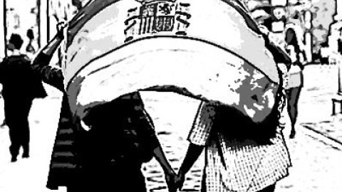 Juan Carlos abdica del trono y la tricolor toma las plazas. "Soy el sentimiento del régimen que estuvo a favor el pueblo", evoca una bandera republicana que cubre, a modo de capa, el lomo de Guillermo. Ha venido a la Puerta del Sol por segundo día consecutivo para exigir un referéndum sobre la monarquía. Ayer la protesta fue floja, pero el lunes la plaza madrileña casi cuelga el cartel de no hay entradas. "Represento la democracia, la justicia social y la igualdad", afirma el paño que luce con orgullo Santiago. "Todos los españoles somos iguales, desde el concejal del pueblo más pequeño hasta el jefe del Estado, por eso la corona es anticonstitucional", añade esta implacable luchadora "contra los privilegios" de unos pocos.