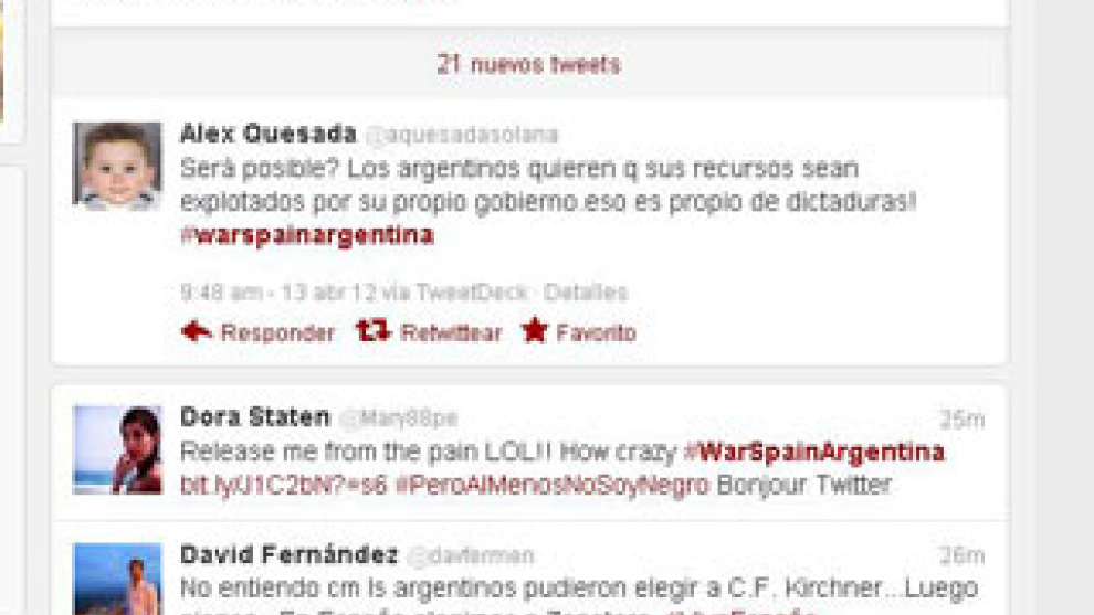 Como ya es costumbre en la red social Twitter, los usuarios no han tardado en empezar a ironizar sobre la intención de Argentina de tomar el control de YPF y las amenazas que hay hecho el ministro español de Industria, José Manuel Soria, que ha afirmó el jueves que cualquier "gesto de hostilidad" contra empresas españolas será interpretado como un gesto "hacia España" y "trae consigo consecuencias".