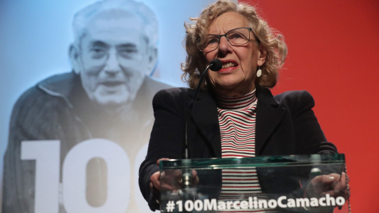 La alcaldesa de Madrid, Manuela Carmena, durante su intervención en el acto con motivo del centenario de Marcelino Camacho, celebrado en la sede de CCOO. EFE/Zipi