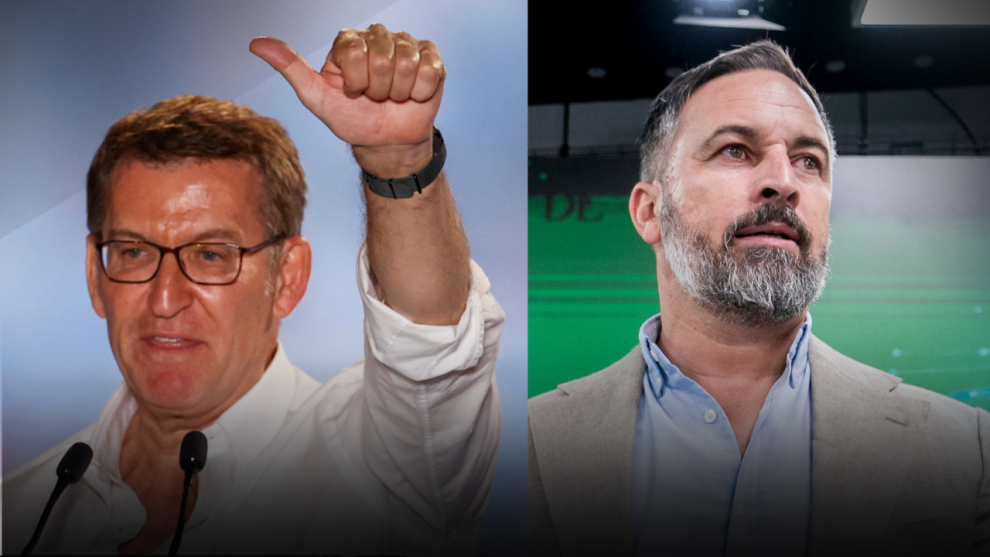 Los líderes del PP y Vox, Alberto Núñez Feijóo y Santiago Abascal, han comparecido tras las elecciones del 23 de julio. El primero ha mostrado una aparente euforia asegurando que tratará de gobernar España. El segundo, sin embargo, ha criticado que los populares hayan "vendido la piel del oso antes de cazarlo".