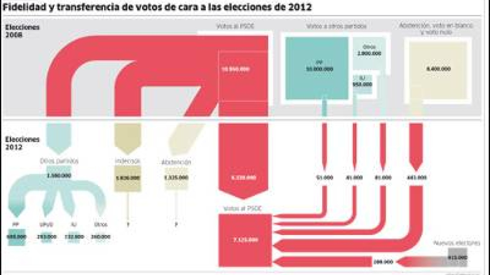 A incrementar el magro resultado del voto socialista vienen, sin embargo, los votos de algunos electores que no votaron al PSOE en 2008. En total, según las intenciones declaradas actualmente, los socialistas contarían con algo más de 900.000 votos nuevos, la mitad de ellos unos 450.000, de personas que se abstuvieron o votaron en blanco en las anteriores elecciones; y otros 290.000, de nuevos electores, personas que no tenían derecho a voto en 2008. Los restantes votos le llegan, en cantidades muy escasas, de otros partidos: unos 50.000 votantes del PP lo harían ahora por el PSOE, y lo mismo, unos 40.000 votantes de IU y 80.000 nacionalistas y de partidos minoritarios. Si se comparan estos flujos positivos con los flujos negativos hacia esos mismos partidos, se observará que el saldo de los intercambios de voto es muy desfavorable para el PSOE: en todos los casos pierde voto y, en total, el saldo negativo de los intercambios es de 1,4 millones de sufragios.