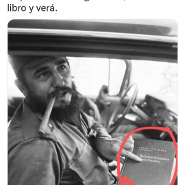 La foto falsa de Fidel Castro con un libro titulado "Esclavos Contentos Guia Practica." Por Luis M. García