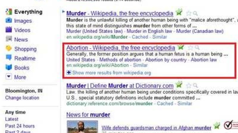 Según denuncia la web Jezabel, un grupo de anti-abortistas con los conocimientos técnicos necesarios, han manipulado los resultados de búsqueda de Google para enviar su mensaje a los internautas. Desde esta mañana, en la lista de resultados a la búsqueda de la palabra "asesinato" (murder, en inglés) aparece en segunda posición la entrada a la Wikipedia para la palabra "aborto". Es una muestra más de las acciones conocidas como Google Bombing.