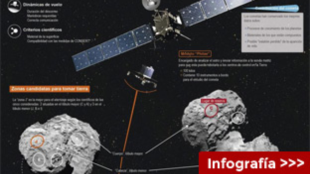 La misión Rosetta, una sonda que ha concluido un viaje de diez años por el sistema solar hasta llegar al cometa en el que tiene previsto aterrizar el próximo noviembre, ha fijado el punto del astro 67/P Churyumov-Gerasimenko donde espera posarse, informó este martes la Agencia Espacial Europea (ESA).