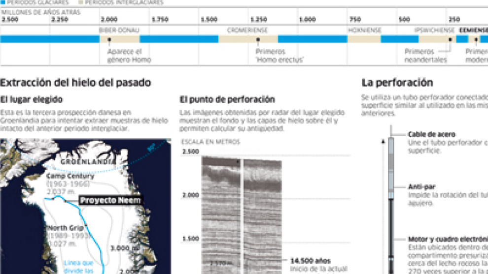 Este verano, un centenar de investigadores de 14 países (entre los que no hay españoles) han conseguido horadar la capa helada hasta los 1.758 metros, antes de que el breve estío polar cediera paso al mal tiempo. El objetivo del proyecto NEEM (Perforación del Hielo Eemiense en el Norte de Groenlandia, por sus siglas en inglés) es llegar al lecho rocoso situado a 2.545 metros el próximo verano o, como muy tarde, en el de 2011.