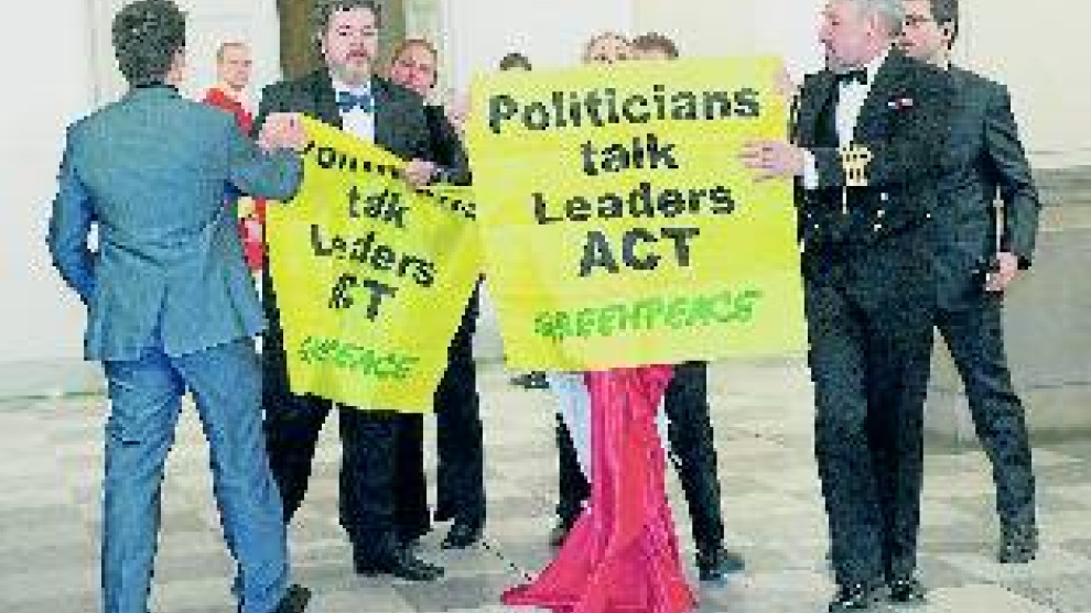 Cuando alcanzaron la entrada del Salón de los Caballeros, donde se celebraba el banquete, desplegaron ante las cámaras dos pancartas en las que podía leerse en inglés: "Los políticos hablan, los líderes actúan". El objetivo de la acción, a 24 horas para el cierre de la cumbre, era instar a los líderes mundiales a que alcanzaran un acuerdo para frenar el cambio climático que nunca llegó.