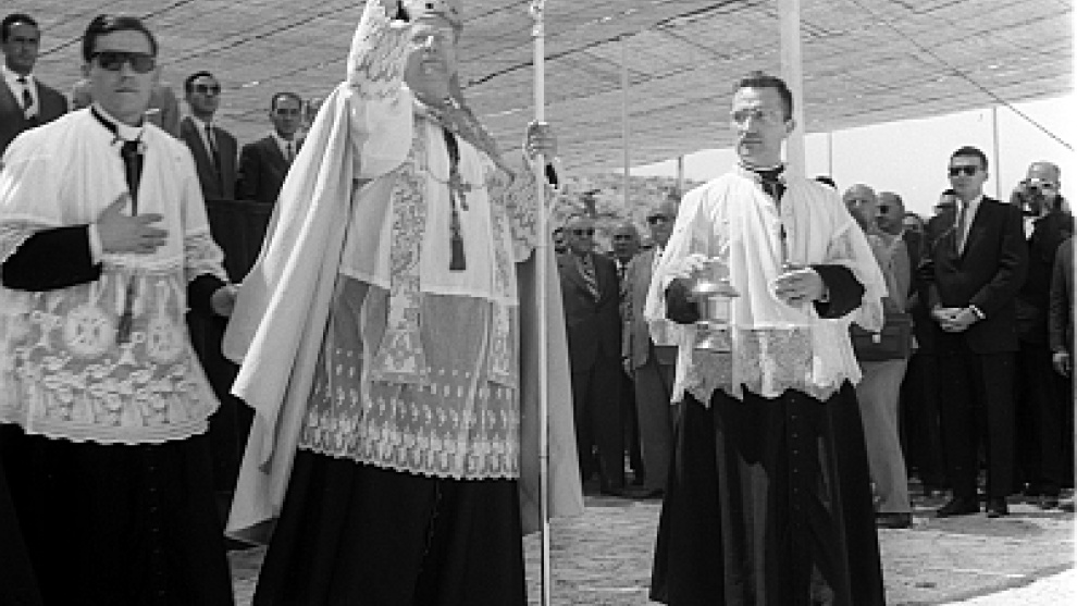 Seis de julio de 1965. El obispo de Sigüenza, Laureano Castán, engalanado con mitra y báculo, levanta su hisopo y rocía de agua bendita la tierra de Almonacid de Zorita (Guadalajara) en la que se levantará la primera central nuclear española, José Cabrera. A su lado, con gesto solemne, un sacerdote con gafas de sol estilo Porrina de Badajoz y el ministro de Industria del Generalísimo, Gregorio López Bravo, que coloca la primera piedra del reactor.