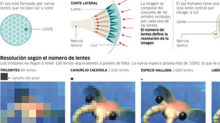 Hace centenares de millones de años, cuando la vida en la Tierra se metamorfoseaba, un bicho similar a una langosta se quitó la ropa en el fondo del mar, como hacen con su piel las serpientes actuales. Antes, probablemente, echaría una mirada a su alrededor y vería a alguno de sus vecinos: desde los famosos trilobites, emparentados con los cangrejos, al Anomalocaris, el tiburón de la época, con casi un metro de longitud y un rostro en el que parece tener clavados dos langostinos. El bicho del striptease los vería perfectamente, gracias a un ojo compuesto por 3.000 lentes, cada una de ellas equivalente al píxel de una foto.