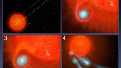 Al entrar la compañera en la atmósfera exterior de la estrella hinchada, ésta engulle material que se asienta en un disco alrededor de la compañera, y sirve como plataforma de lanzamiento para manchas de plasma, que viajan, aproximadamente, a medio millón de millas por hora. "Por datos anteriores, sabíamos que este objeto tenía una salida de alta velocidad, pero esta es la primera vez que vemos este proceso en acción", ha afirmado Raghvendra Sahai del Jet Propulsion Laboratory de la NASA en Pasadena, California, autor principal del estudio.