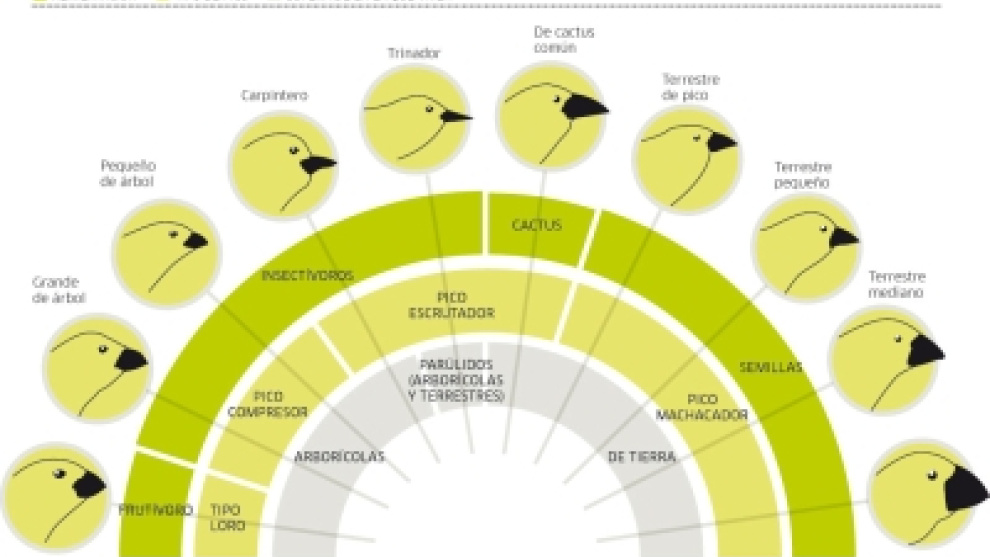 Cada tipo de pinzón lo tenía diferente en función de su dieta: los que vivían en el suelo lo tenían ancho, los que habitaban en zonas de cactus lo tenían alargado... Darwin planteó que todos tendrían un antepasado común que habría emigrado a la isla tiempo atrás. Después, por selección natural, habrían comenzado a aparecer las nuevas especies. Desde entonces, el caso de los pinzones se ha convertido en un ejemplo clásico para explicar la aparición de nuevas especies a partir de un tronco común como método de adaptación a los distintos nichos ecológicos.