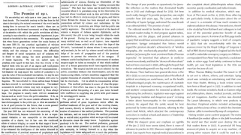 El de hace un siglo, con el título La promesa de 1911, hablaba de avances impensables para la época en la lucha contra la rabia, la difteria y la peste. Sin embargo, lamentaba que los avances en la medicina fueran despacio y que, en el año que concluía (1910) "no se hubiera exorcizado al demonio de la tuberculosis". Como subraya el primer editorial de 2011 en la misma revista, Un nuevo año en medicina, aunque 2011 "trae nuevas promesas y oportunidades, algunos demonios permanecen" y la tuberculosis sigue siendo una importante causa de muerte en los países en vías de desarrollo e, incluso, se registran casos en países donde previamente había desaparecido, desde Reino Unido hasta España.