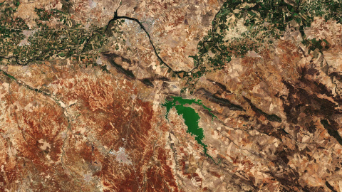 "También puede apreciarse el río Guadiana, atravesando el centro de la imagen, junto con otros arroyos, fundamentales para el sistema de riego en muchos de los campos de esa zona tan seca", indicó la Agencia Espacial Europea.