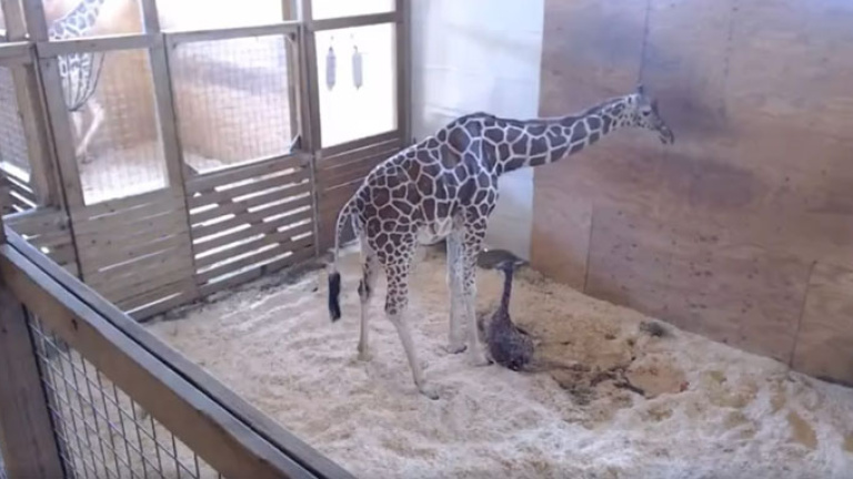 April, la jirafa más célebre de Nueva York, parió hoy a su cría ante la mirada de más de un millón de personas que atendían a la transmisión por Facebook y Youtube.