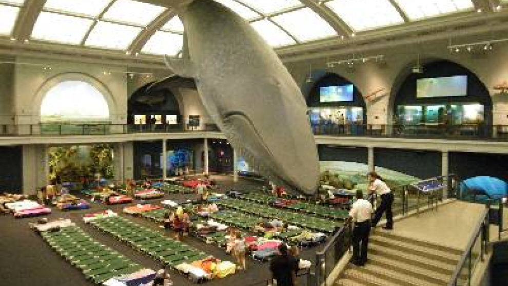 Se entra al museo a las cinco y media, cuando el público se marcha, y a esa hora se produce la primera escena extraña: padres, con una almohada bajo el brazo, acompañados por niños con sacos de dormir y linternas, cruzan las calles cercanas, antes de perderse bajo una inmensa bola blanca con anillo a lo Saturno. Es la puerta del Planetario, una de las atracciones.