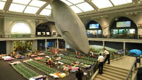 Tras registrarse en recepción, los inusuales campistas, un máximo de 450, son trasladados a la Sala del Océano. Allí, bajo la reproducción a tamaño real de una ballena azul, les esperan otros tantos catres de campaña. Se colocan rápidamente los sacos de dormir, las almohadas y un pequeño neceser con el cepillo y la pasta de dientes. Luego comienza la visita hacia las siete menos cuarto de la tarde.