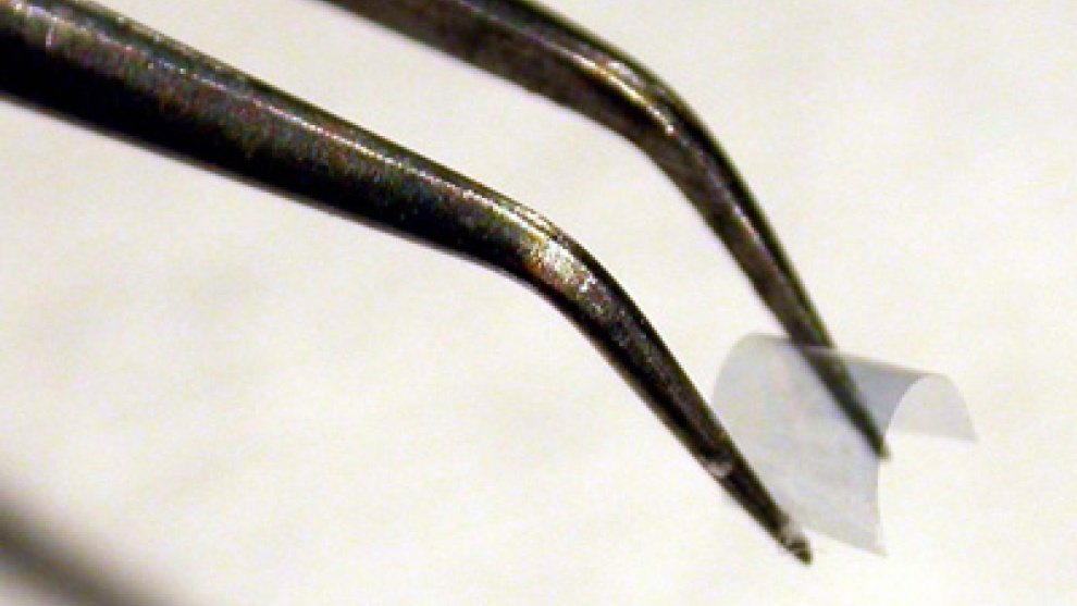 Tras sumergir el material en un disolvente químico (el metilpirrolidón), obtuvieron capas lo más finas y grandes posibles, logrando algunas de apenas cuatro micrómetros de grosor (la millonésima parte de un metro) y un área de 5x8 milímetros cuadrados, tan flexibles como puede verse en la imagen superior.