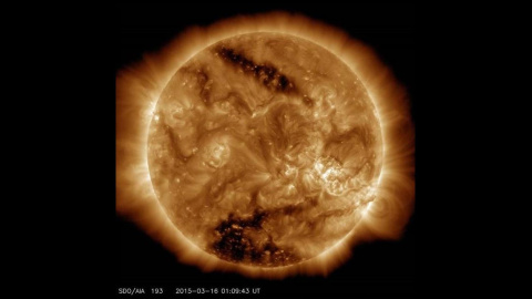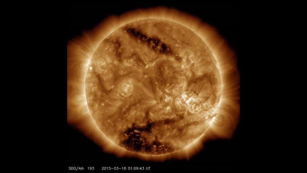 El Observatorio de Dinámica Solar (SDO) de la NASA, capturó esta imagen solar el 16 de marzo, que muestra claramente dos manchas oscuras, conocidas como agujeros coronales.