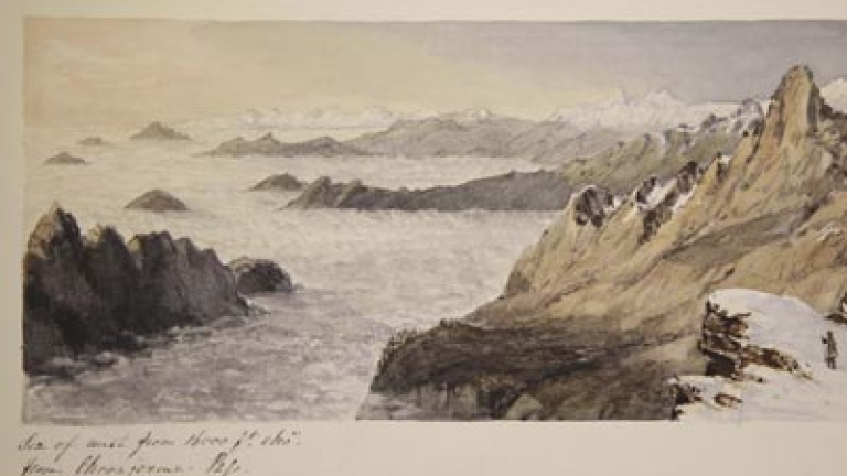 El científico Joseph Hooker no fue al Himalaya a dibujar, sino que viajó a estudiar la vegetación. Su misión en aquella parte del mundo era recoger plantas y flores, catalogarlas, dibujarlas y llevarlas a Inglaterra, el país que en el siglo XIX tenía el mayor imperio del mundo. Hooker, además, escribía extensos diarios, que han permitido conocer hasta el día exacto que se plantó a reproducir la silueta de las montañas del Himalaya. "De una altura prodigiosa", escribe el botánico cuando la montaña más alta del mundo era conocida como "Chomolungma" en la zona. Fue identificada como Everest en 1856 en honor a de Sir George Everest, ingeniero general británico en India.