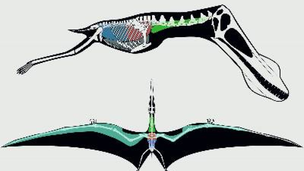 Según el artículo, una de las clave del vuelo de estos animales del Mesozoico (vivieron hace unos 200 millones de años) se encuentra en su sistema respiratorio. Un análisis comparativo con escáner de fósiles de estos animales con otros seres extintos y algunos aún vivientes permitió deducir que los pterosaurios tenían bolsas de aire repartidas por todo el cuerpo que conectaban con los pulmones.
