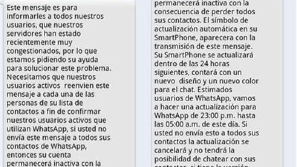 Whatsapp es una aplicación muy popular entre los usuarios de 'smartphones', ya que permite escribir mensajes fácilmente a todos los contactos de la agenda, sin necesidad de utilizar un servicio de mensajería instantáneta, como Messenger, Gtalk, etc... Los usuarios reciben un mensaje de un contacto o un número desconocido en Whatsapp que asegura que los servidores de Whatsapp han estado saturados y que se va a proceder a una tarea de mantenimiento. El mensaje incita a los usuarios a reenviar el texto a sus contactos con el fin de difundir la noticia. En caso contrario, promete que Whatsapp dejará de estar operativo.