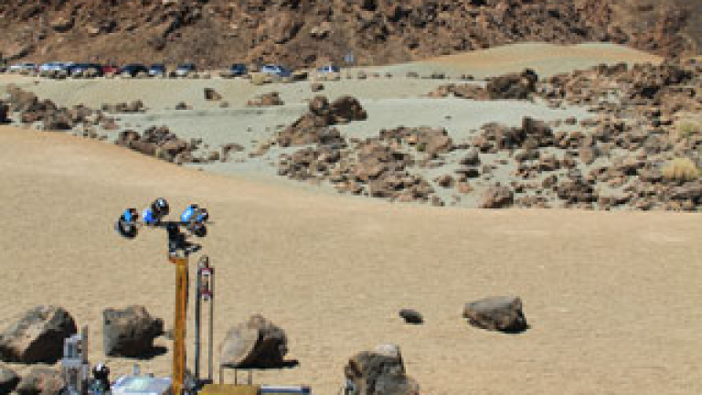 Las Cañadas del Teide, en Tenerife, se ha convertido en un campo de pruebas de prototipos diseñados para la exploración de otros planetas. Ante las miradas extrañadas de los cientos de turistas que visitan la zona, un rover se ha paseado por diversos lugares del parque nacional, durante los últimos días, para realizar pruebas de campo de la última tecnología espacial.