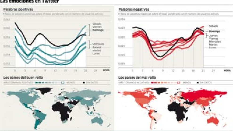 De hecho, la noche de los sábados se produce un fenómeno llamativo: entre las 20.00 horas del sábado y las 3.00 del domingo se da el mayor pico de tuits positivos, pero también de tuits negativos. En el mundo actual, en el que el 45% de los mensajes publicados en esta red social se envía desde los móviles, este dato invita a imaginar una discoteca llena de gente tuiteando la montaña rusa de emociones en que se puede convertir una noche de marcha.