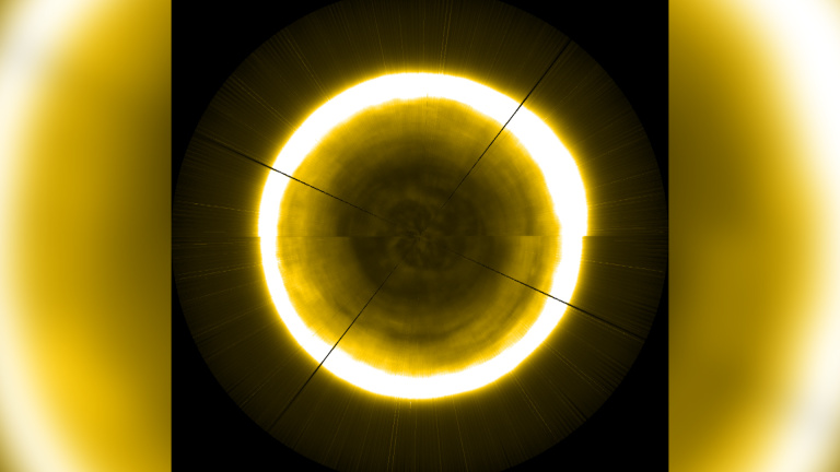 Una extrapolación de las observaciones a baja latitud del Sol efectuadas por la misión Proba-2 de la ESA ha servido para reconstruir una vista del polo norte de nuestra estrella. Aunque los polos no se pueden ver directamente, cuando la nave observa la atmósfera solar, recoge datos de todo lo que aparece en su línea de visión, incluida la atmósfera que se extiende a lo largo del disco solar (el brillo aparente alrededor del disco principal del Sol, que también se extiende por los polos).